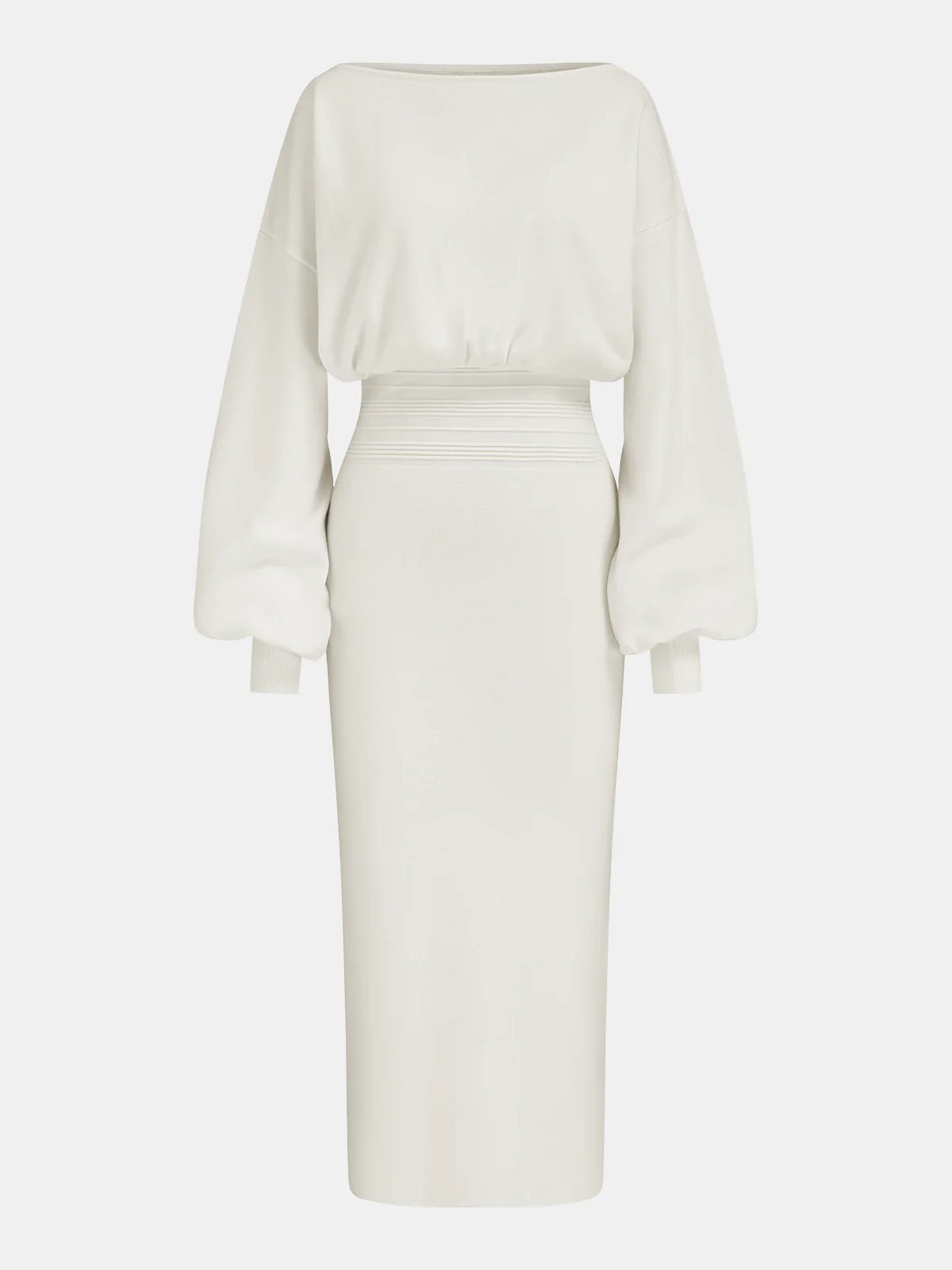 Waist-Defined Balloon-Sleeve Knit Midi Dress